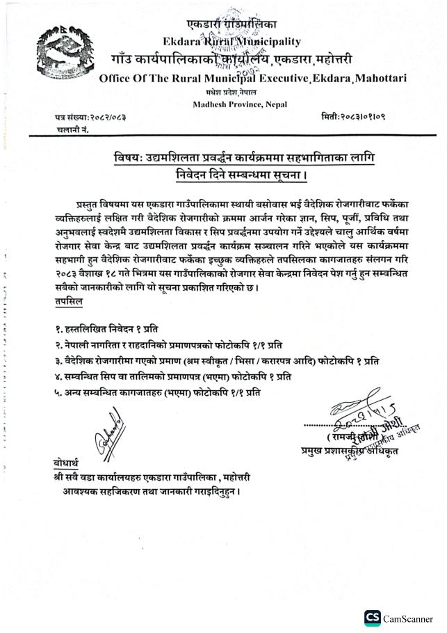 उद्धमशिलता प्रवर्धन कार्यक्रममा सहभागिताका लागि निबेदन दिने सम्बन्धमा सुचना