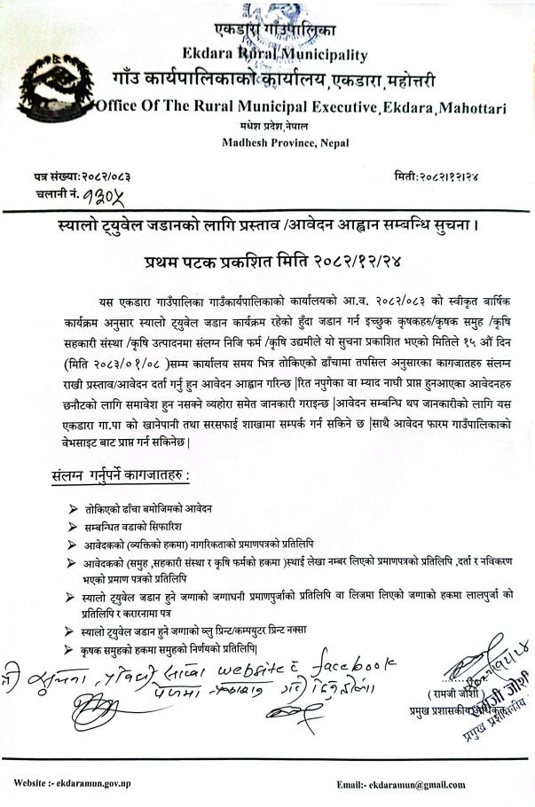 स्यालो ट्यूबेल जडानको लागि प्रश्ताव/आवेदन आव्हान सम्बन्धी सूचना